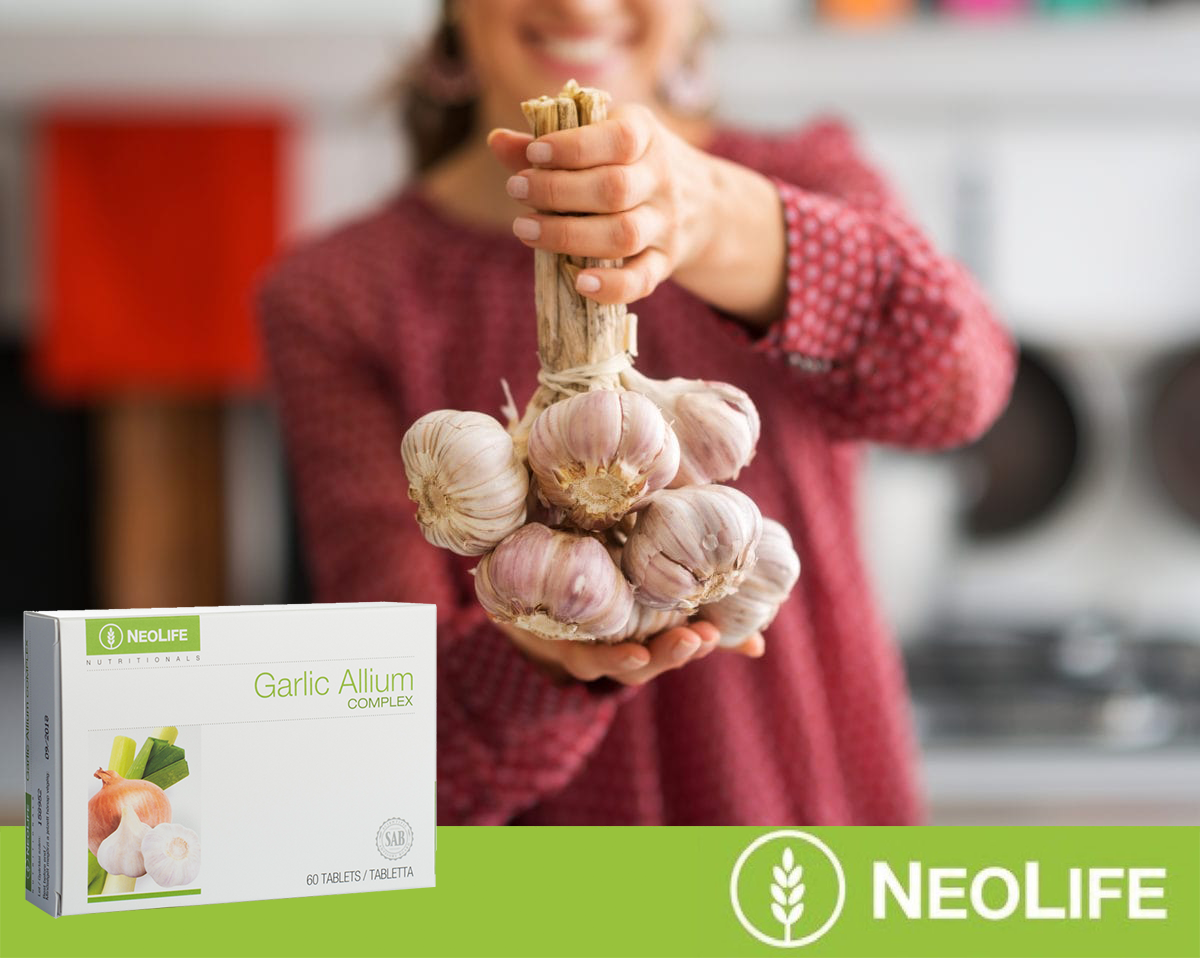 a) sustiprinkite savo imunitetą pasitelkę česnakines daržoves! Neolife “Garlic Allium Complex” yra puiki išeitis, gauti visą česnakinių daržovių naudą ir išvengti nemalonaus kvapo kasdien. Laboratorijose atlikti tekstai patvirtino, kad apvalkalą turinčios Neolife “Garlic Allium Complex” netirpsta skrandžio rūgštyje. Kai tabletę pasiekia šarmingą žarnyno aplinką, ji greitai ištirpsta suteikdama bioaktyvių elementų, kurie maksimaliai nekinta ir yra absorbuojami. Tikslingas pristatymas leidžia išvengti nemalonaus kvapo ir skonio problemų, kurios yra įprastos valgant šias daržoves! Kiekvienoje dozėje yra 4200 mcg gryno alicino, o taip pat svogūnų, laiškinių česnakų ir porų bioaktyvių medžiagų!
