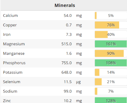 Arbūzų sėklų maistinė vertė, remiantis NCCDB (Nutrition Coordinating Center Food & Nutrient Database) or USDA SR28 (United States Department of Agriculture National Nutrient Database for Standard Reference), Harward Health Publishing.
