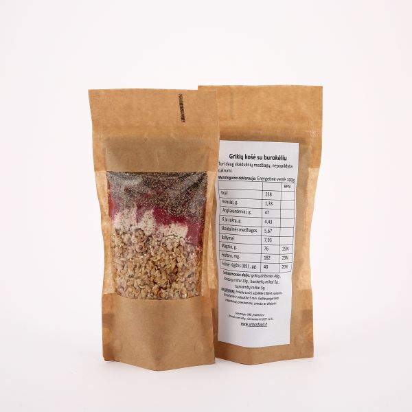 Sudedamosios dalys: grikių dribsniai (40 g.), kanapių milteliai (10 g.), burokėlių milteliai (5 g.), topinambų milteliai (5 g.).