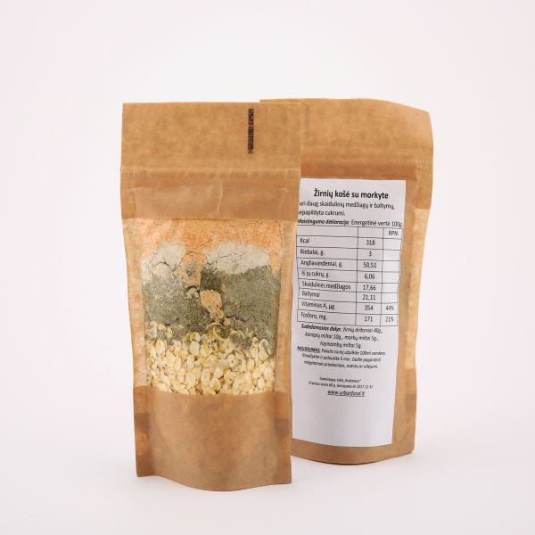 Sudedamosios dalys: žirnių dribsniai (40 g.), topinambų milteliai (5 g.), kanapių milteliai (10 g.), morkų milteliai (5 g.).
